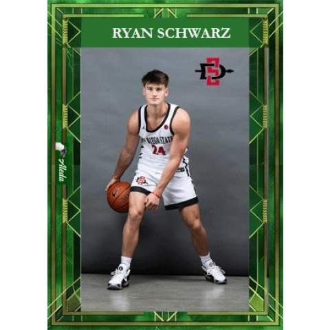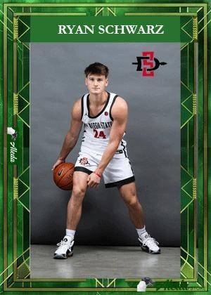 This trading card is comprised of 4 high resolution images and a film clip of Ryan Schwarz playing basketball for SDSU. The web view contains low resolution teaser images and a clipped video. By purchasing the digital trading card, you can access the high resolution images and video, which you may download. By purchasing this card, the athlete will receive compensation directly to help with their student athlete goals through the NIL (Name Image Likeness) program.