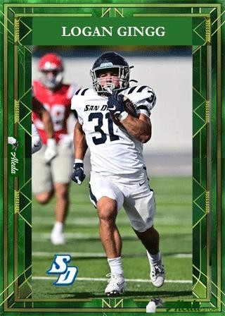 This trading card is comprised of 5 high resolution images and a film clip of Logan Gingg playing football for USD. The web view contains low resolution teaser images and a clipped video. By purchasing the digital trading card, you can access the high resolution images and video, which you may download. By purchasing this card, the athlete will receive compensation directly to help with their student athlete goals through the NIL (Name Image Likeness) program.