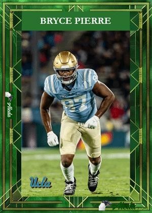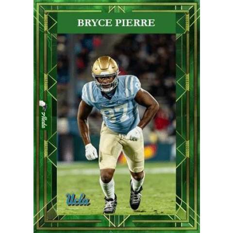 This trading card is comprised of 5 high resolution images and a film clip of Bryce Pierre playing football for UCLA. The web view contains low resolution teaser images and a clipped video. By purchasing the digital trading card, you can access the high resolution images and video, which you may download. By purchasing this card, the athlete will receive compensation directly to help with their student athlete goals through the NIL (Name Image Likeness) program.