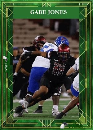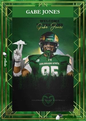 This trading card is comprised of 4 high resolution images of Gabe Jones playing football for New Mexico State University. He has transferred to Colorado State University.  The web view contains low resolution teaser images and a clipped video. .By purchasing the digital trading card, you can access the high resolution images and video, which you may download. By purchasing this card, the athlete will receive compensation directly to help with their student athlete goals through the NIL (Name Image Likeness) program.