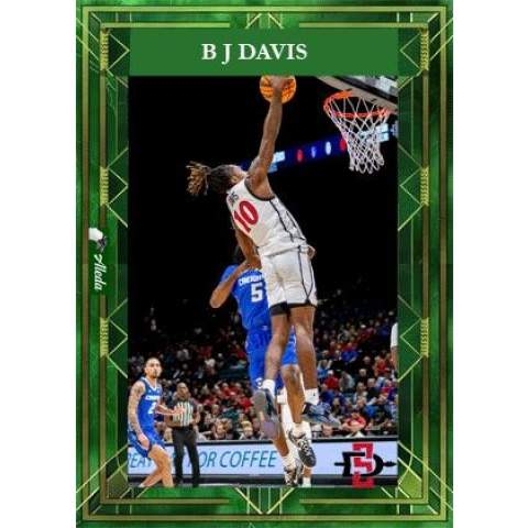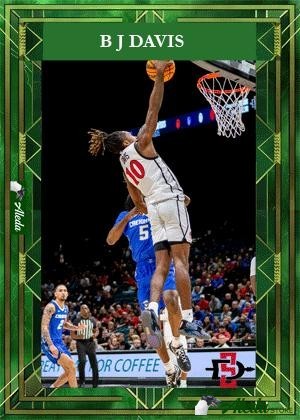 This trading card is comprised of 5 high resolution images of BJ Davis playing basketball for SDSU. The web view contains low resolution teaser images and a clipped video. .By purchasing the digital trading card, you can access the high resolution images and video, which you may download. By purchasing this card, the athlete will receive compensation directly to help with their student athlete goals through the NIL (Name Image Likeness) program.