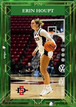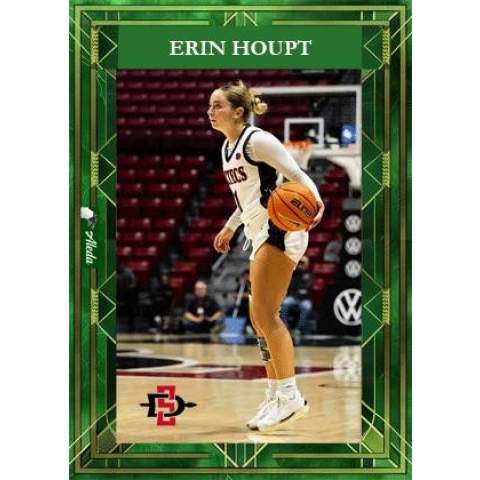 This trading card is comprised of 4 high resolution images and 2 video clips of Erin Houpt  playing basketball for SDSU. The web view contains low resolution teaser images and a clipped video. .By purchasing the digital trading card, you can access the high resolution images and video, which you may download. By purchasing this card, the athlete will receive compensation directly to help with their student athlete goals through the NIL (Name Image Likeness) program.