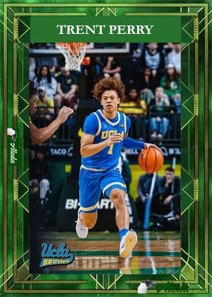 This trading card is comprised of 3 high resolution images and a film clip of Trent Perry playing basketball for UCLA. The web view contains low resolution teaser images and a clipped video. .By purchasing the digital trading card, you can access the high resolution images and video, which you may download. By purchasing this card, the athlete will receive compensation directly to help with their student athlete goals through the NIL (Name Image Likeness) program.