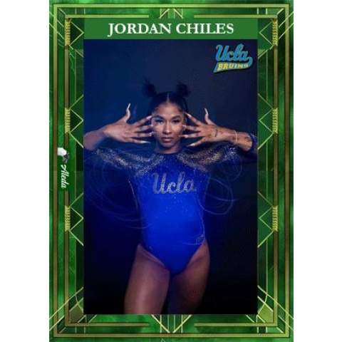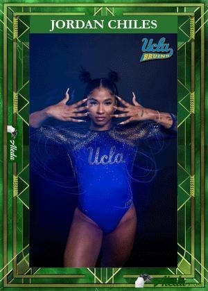This trading card is comprised of 4 high resolution images and a film clip of Jordan Chiles competing for UCLA. The web view contains low resolution teaser images and a clipped video. .By purchasing the digital trading card, you can access the high resolution images and video, which you may download. By purchasing this card, the athlete will receive compensation directly to help with their student athlete goals through the NIL (Name Image Likeness) program.