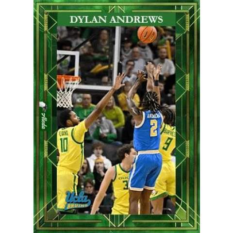 A last-second bank 3-pointer from junior guard Dylan Andrews led UCLA to a 2-point win, This trading card contains 2 photographs and 2 videos of Dylan, one with the game winning shot and two with his postgame interview to highlight play.