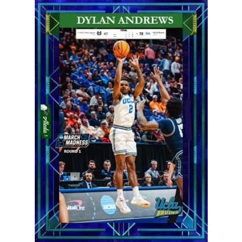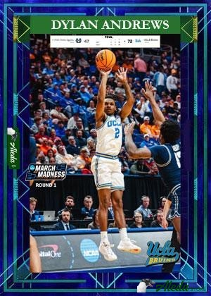 Dylan Andrews, #2, Guard for UCLA, landing a jumper, plus video from the game and interview after. Footage from Round 1 of the NCAA March Madness Tournament. UCLA vs. Utah State, Final Score 72-47. Aleda Trading card contains 2 high resolution photos of Dylan and a video from the game.