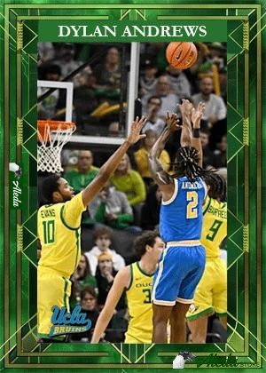 A last-second bank 3-pointer from junior guard Dylan Andrews led UCLA to a 2-point win, This trading card contains 2 photographs and 2 videos of Dylan, one with the game winning shot and two with his postgame interview to highlight play.