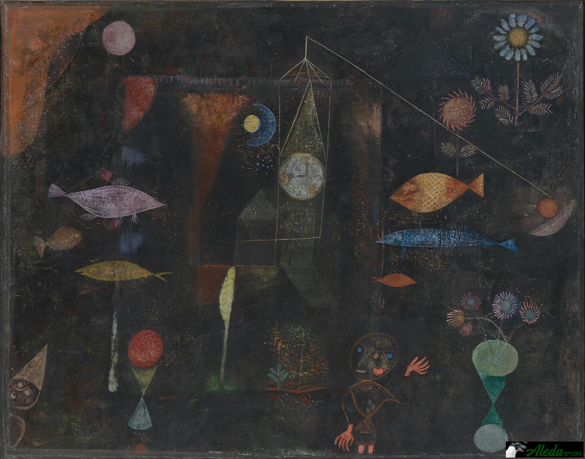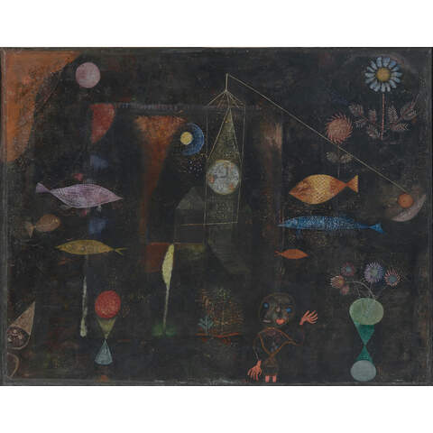 In Fish Magic, Paul Klee creates a magical realm where the aquatic, the celestial, and the earthly intermingle. A delicate black surface covers an underlayer of colors, which the artist revealed by scratching and scrawling designs in the black paint. At the center of the painting, a square of muslin is glued onto the canvas. A long diagonal line reaching to the top of the clock tower is poised as if to whisk off this subtle curtain.