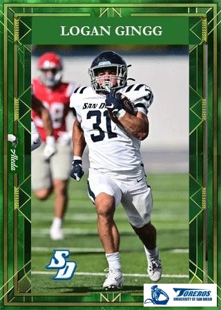 This trading card is comprised of 5 high resolution images and a film clip of Logan Gingg playing football for USD. The web view contains low resolution teaser images and a clipped video. By purchasing the digital trading card, you can access the high resolution images and video, which you may download. By purchasing this card, the athlete will receive compensation directly to help with their student athlete goals through the NIL (Name Image Likeness) program.